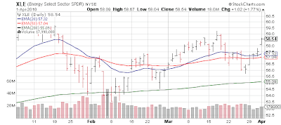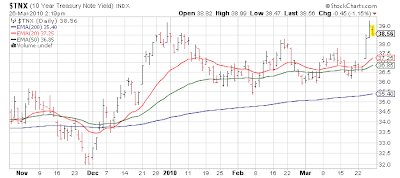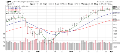 After last week's ISM Manufacturing, and Friday's jobs report there is nothing that weighty this week in economic reports other than ISM Services Monday (forecast at 54). While ISM Manufacturing gets all the attention, the Services sector is much more in line with the structure of the US economy. With earnings season starting in earnest the week of April 12th with the traditional missed estimates earnings report of Alcoa (AA), we have a dead zone most of this week. Perfect for more low volume, grind it out, and mark it up in premarket action. With perhaps a death defying 0.3% loss thrown in for grins. Until the market reacts poorly to good news (as has happened quite a bit the past 2 earnings seasons) it's hold the course. I'll talk more about earnings season next week, but this will be the last of the "incredibly easy" quarterly comparisons [Jan - Mar '10 v Jan - Mar '09] year over year. Let us keep an eye on some bond auctions this week - 10 years are Wednesday and 30 years Thursday. Two weeks ago some not so great bond auctions caused the market to pause.... for 30 minutes or so. ;)
