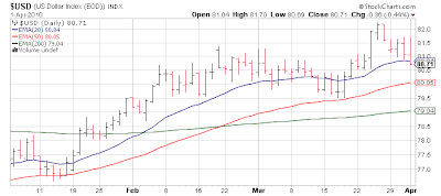 On the short side, it continues to be almost impossible to run any sort of hedged strategy as 90% of stocks now trade over the 50 day moving average. After suffering a poor Q1, Chinese stocks seem to have perked up this past week Morgan Stanley China A Shares (CAF) was closed as the instrument broke out; perhaps a possible long position in fact. And Asia Info Holding (ASIA) I expect to be stopped out on the Monday morning gap up as it was right at my stop loss level Friday at the close... I needed some 1-3% type of market selloff for this name to fill it's gap, but that is too much to ask. Once ASIA goes the only meaningful short I will have is "dollar long" - countless scouts have been sent back to us the past 4-5 weeks with heads detached on the short side; we've been keeping losses small but it is wearisome.