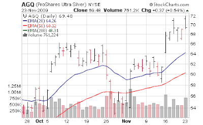 2) On that note - we've been more exposed to silver than gold which was the correct play 6+ weeks ago, but gold has actually been better in the past month. As silver hits a new high for the year yesterday, I am going to employ a similar strategy to gold and take off 90% of our remaining 1% position. We took multiple rounds of profits in our ProShares Ultra Silver (AGQ) so this will obviously be the last round, until we can buy some back lower. I had originally planned to take another round of profits at $66 but once more tried to remain a bit more patient than usual and it's worked out. The ETF is about 20% in the past 1.5 weeks. Again in no way, shape, or form am I saying gold or silver will selloff today, tomorrow, Friday, or next week - I have no idea.