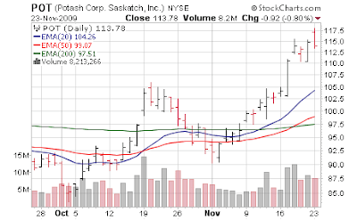 4) We restarted a position in Potash (POT) last week on a breakout over the $106 level (our cost is $107ish); so far a "textbook" breakout. However yesterday's action (reversal) was not super hot. I am not going to outright sell today but I have placed a stop loss for half the 2% position at $112. Overall strategy is to lock in a gain on any correction with half the position, and try to rebuy somewhere in the $105-$107 range if and when. Then if (a) the stock breaks down, the losses we take would be offset by the gains we locked in or (b) the stock continues to surge after breaking $112 - we at least have half our position on. Obviously if there is no pullback to $112 or below, it's a moot conversation and the beat goes on.