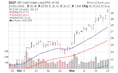 1) Powershares DB Gold Double Long (DGP) - I have a bad habit that is pretty typical of most investors, and that is to cut winners off at the knees to soon. But that is part and parcel with cutting losers off quickly as well, and overall the strategy is fine. I've been able to let gold run without the compulsion of taking profits so I'm content with participating in this epic run, but obviously wish we had a larger stake. I don't have trailing stops in my tracking mechanism, Investopedia.com, so in a real life situation I might just slap a 5% trailing stop and let it run - but I have to work within the confines of what I have. I am down to a 1% position after earlier profit taking so I'm going to take profits on 90% of the position after a 25% run in 1 month as the chart of gold begins to hit parabolic range. Any upside from here, I'll let others enjoy and try to catch it on a pullback in the future; everywhere I turn now - in every magazine and website are stories of gold. This does not change my long term view here - but financial instruments are all the same to me... when they go up, I want to lock in profits and try to buy back cheaper.