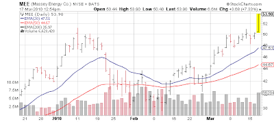 As much as I am a long term bull on these coal names (and have been since 2007), the moves of late remind me of when companies announced a stock split or a new website launch in 1999 and speculators ran into the stock, driving it up 15% overnight. Right now people are frothing at the mouth for anything coal - specifically metallurgical coal related (which is the type of coal that goes into steel). [Mar 8, 2010: BHP Billiton Pushes Through 55% Price Increase in Coaking Coal Prices, Quarterly Pricing - Iron Ore Also Potentially Set to Soar] Massey Energy announced a purchase ($1B) deal Tuesday evening and the stock is flying today.