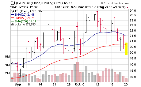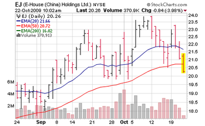 Last Thursday, we cut back E-House Holdings (EJ) by 60% as it triggered a stop loss in the $20.30s and broke support, under the 50 day moving average. This took us down from a 1.6% exposure to 0.6%. The chart looked like this on Thursday: