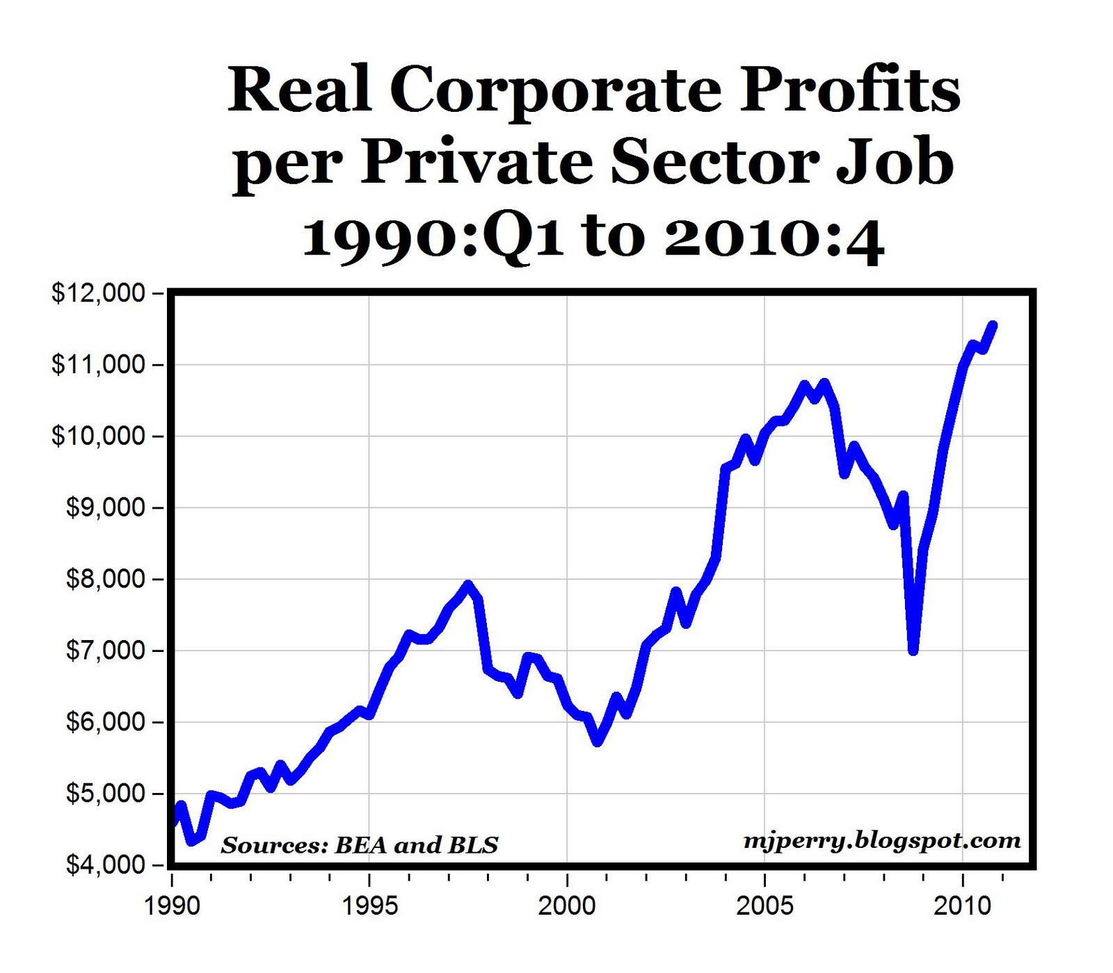 What does that surge in worker productivity surge mean for the bottom lines of American companies?  The bottom chart above shows that real corporate profits per private sector job reached an all-time record historical high of $11,552 in the fourth quarter of 2010 (measured in 2010 dollars).  That's 65% higher than the recession-low of about $7,000 per worker in fourth quarter of 2008 and 7.5% above the pre-recession high of $10,740 in 2006.