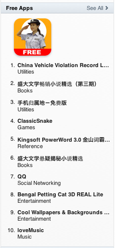 The number one paid app in China is the Plants vs. Zombies game. The number one free app in China is China Vehicle Violation Record Lookup. The top-grossing (made the most $ for the developer) app in China is Autonavi (GPS Navigation).
