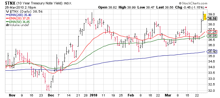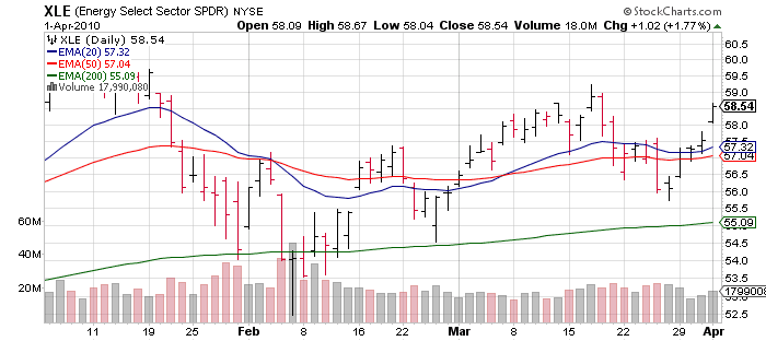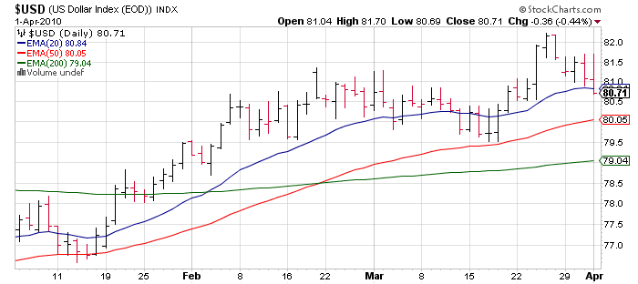 After last week's ISM Manufacturing, and Friday's jobs report there is nothing that weighty this week in economic reports other than ISM Services Monday (forecast at 54). While ISM Manufacturing gets all the attention, the Services sector is much more in line with the structure of the US economy. With earnings season starting in earnest the week of April 12th with the traditional missed estimates earnings report of Alcoa (AA), we have a dead zone most of this week. Perfect for more low volume, grind it out, and mark it up in premarket action. With perhaps a death defying 0.3% loss thrown in for grins. Until the market reacts poorly to good news (as has happened quite a bit the past 2 earnings seasons) it's hold the course. I'll talk more about earnings season next week, but this will be the last of the "incredibly easy" quarterly comparisons [Jan - Mar '10 v Jan - Mar '09] year over year. Let us keep an eye on some bond auctions this week - 10 years are Wednesday and 30 years Thursday. Two weeks ago some not so great bond auctions caused the market to pause.... for 30 minutes or so. ;)
