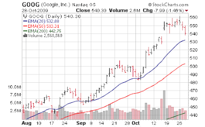 (5) Let's look at our "leadership" stocks - I am going to pick 4. In tech Apple (AAPL) and Google (GOOG), in financials Goldman Sachs (GS), and in commodities Freeport McMoran Copper & Gold (FCX) has become the "go to" stock for this round of "recovery / inflation / the dollar stinks" trade.