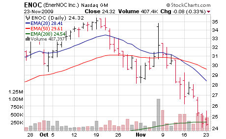 7) I placed a full stop loss (i.e. the whole position will be exited) for yesterday's purchase of EnerNOC (ENOC) in the $23.80s so our maximum loss will be 4%. The "red bars" continue on this one.