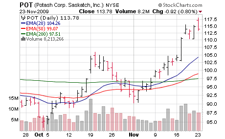 4) We restarted a position in Potash (POT) last week on a breakout over the $106 level (our cost is $107ish); so far a "textbook" breakout. However yesterday's action (reversal) was not super hot. I am not going to outright sell today but I have placed a stop loss for half the 2% position at $112. Overall strategy is to lock in a gain on any correction with half the position, and try to rebuy somewhere in the $105-$107 range if and when. Then if (a) the stock breaks down, the losses we take would be offset by the gains we locked in or (b) the stock continues to surge after breaking $112 - we at least have half our position on. Obviously if there is no pullback to $112 or below, it's a moot conversation and the beat goes on.
