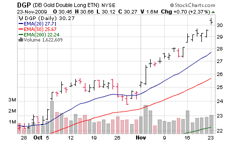 1) Powershares DB Gold Double Long (DGP) - I have a bad habit that is pretty typical of most investors, and that is to cut winners off at the knees to soon. But that is part and parcel with cutting losers off quickly as well, and overall the strategy is fine. I've been able to let gold run without the compulsion of taking profits so I'm content with participating in this epic run, but obviously wish we had a larger stake. I don't have trailing stops in my tracking mechanism, Investopedia.com, so in a real life situation I might just slap a 5% trailing stop and let it run - but I have to work within the confines of what I have. I am down to a 1% position after earlier profit taking so I'm going to take profits on 90% of the position after a 25% run in 1 month as the chart of gold begins to hit parabolic range. Any upside from here, I'll let others enjoy and try to catch it on a pullback in the future; everywhere I turn now - in every magazine and website are stories of gold. This does not change my long term view here - but financial instruments are all the same to me... when they go up, I want to lock in profits and try to buy back cheaper.