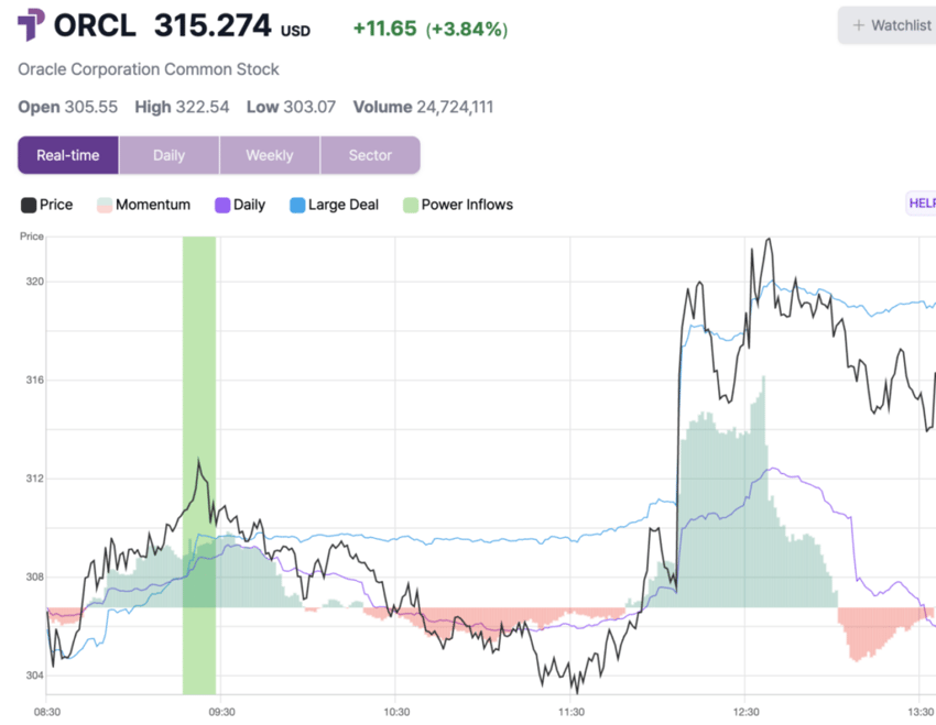 Oracle Corporation (NYSE:ORCL) experienced a significant Power Inflow alert, a key bullish indicator that is closely tracked by traders who value order flow analytics, specifically institutional and retail order flow data.