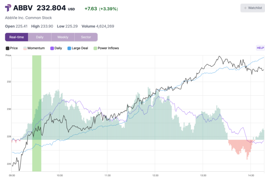 AbbVie Inc (NYSE:ABBV) experienced a significant Power Inflow alert, a key bullish indicator that is closely tracked by traders who value order flow analytics, specifically institutional and retail order flow data.