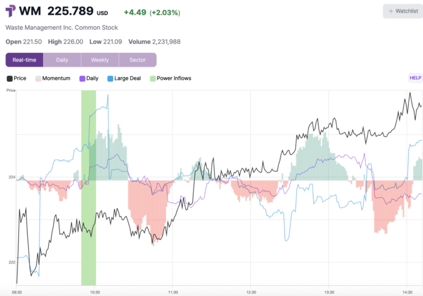 At January 21 at 10:27 AM EST, WM triggered a Power Inflow signal at a price of $222.60. WM's price in the opening hour of trading had been mostly stagnant, even dropping slightly prior to the signal. At the time of the signal, and then thereafter, both retail and institutional trading interest in WM shifted toward the buy side, leading to a steady rise in the stock price, eventually reaching a post-alert high of $226.15 as of 2:45PM EST. This Power Inflow signal is intended to be a bullish indication of institutional and retail interest, highlighting where traders may be entering the market for the stock.