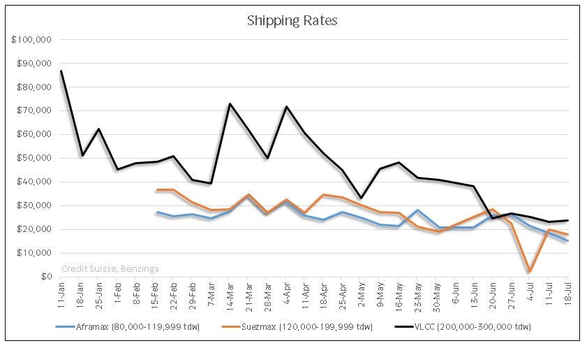 Tankers have struggled over the past year as day rate volatility drove uncertainty for those seeking charters. Using data from Credit Suisse, Benzinga plotted the day rates for Suexmax, Panamax, and Aframax shippers since the start of the year: