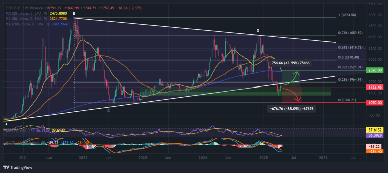 Should Ethereum reclaim resistance at $1,960 and break back into the triangle pattern, the next major target sits at $2,520—a 40% move from current levels.