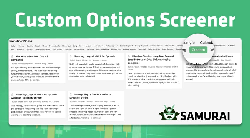 Option Samurai, a leading fintech platform for options traders, has launched its most powerful feature to date: the Custom Options Screener. This powerful tool lets investors build any strategy (standard or unconventional) and scan the entire market to find trades that they couldn't find previously.