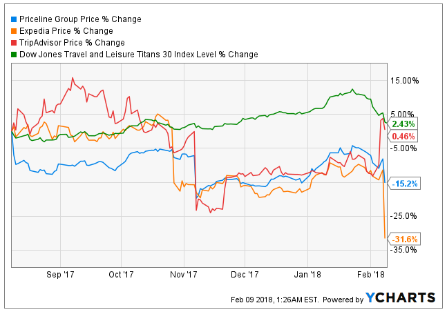 The chart below shows how the shares of major travel companies on Wall Street have fared in the last six months. You can see that the share price of Expedia Inc (NASDAQ:EXPE) has declined more than 31 percent, Priceline Group Inc (NASDAQ:PCLN) has lost more than 15 percent in its trading price, TripAdvisor Inc (NASDAQ:TRIP) is up a negligible 0.46 percent, and the Dow Jones Travel and Leisure Titans index is up a measly 2.43 percent.