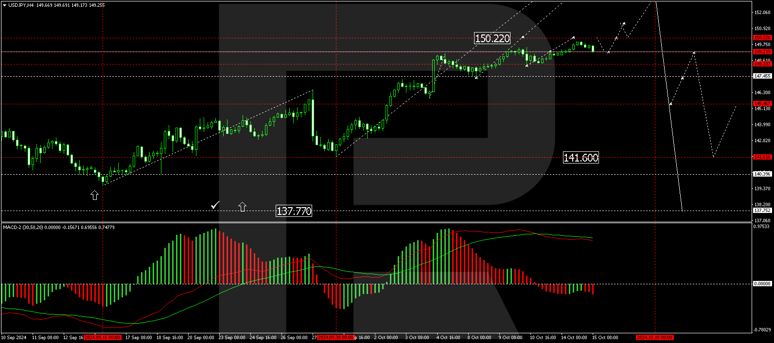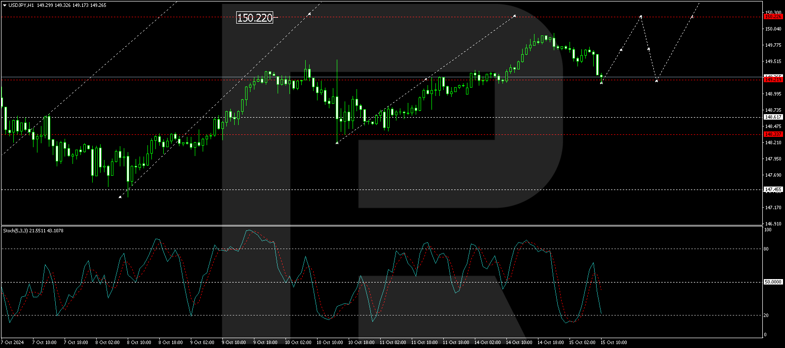 On the hourly chart, USD/JPY has completed a growth wave to 149.96 and is undergoing a correction to 149.22. Following this corrective phase, the market is expected to resume its upward trajectory towards 150.22. This movement aligns with the Stochastic oscillator's current trajectory, which shows the signal line moving upwards from 50 towards 80, indicating potential for further gains in the short term.