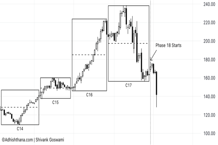 Between Phases 4 and 8, the stock formed a typical Adhishthana Cakra, a sideways arc or channel, which it broke out of in Phase 9. That breakout launched the Adhishthana Himalayan formation, with the stock rallying ~96% in Phase 9 and another ~113% in Phase 10.
