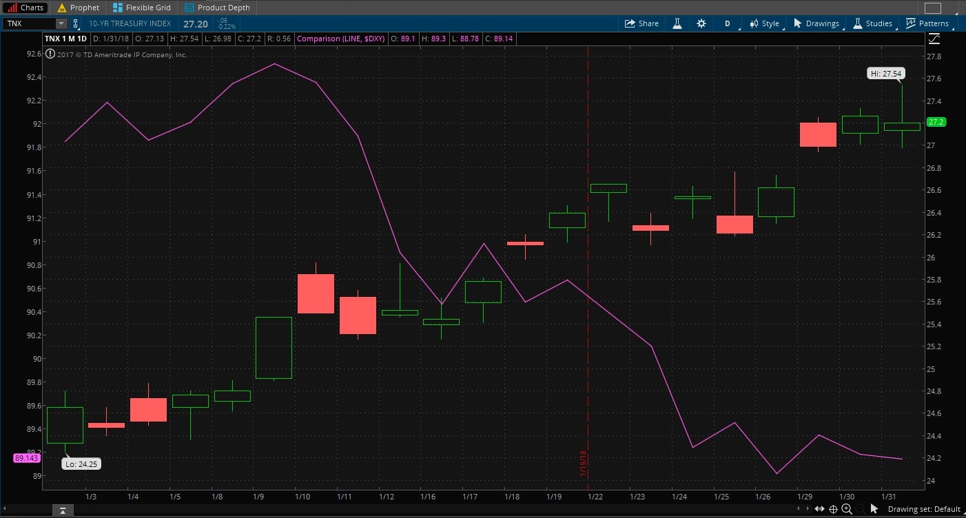 In data news, The Chicago PMI for January hit 65.7, down from 67.6 in December. It looks like manufacturing activity in the Chicago Fed region is still humming along near multi-year high levels. The January 2018 reading was the best January reading in seven years, Briefing.com noted.