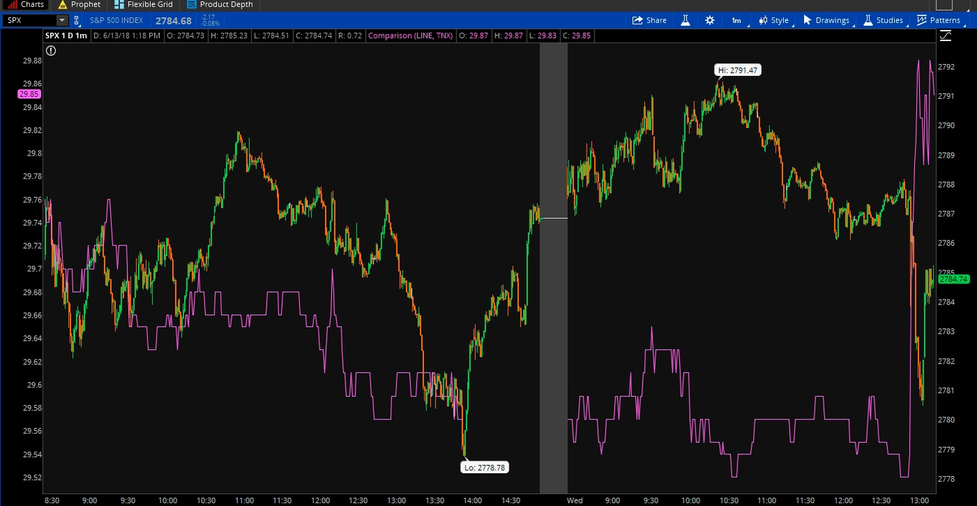 Figure 1: Separate Ways: In the minutes after the Fed raised rates Wednesday, the S&P 500 (candlestick) took a slight dip, while yields on the 10-year Treasury (purple line) jumped but remained below the psychological 3 percent mark. Data source: S&P Dow Jones Indices, CME Group. Chart source: The thinkorswim® platform from TD Ameritrade. For illustrative purposes only. Past performance does not guarantee future results.