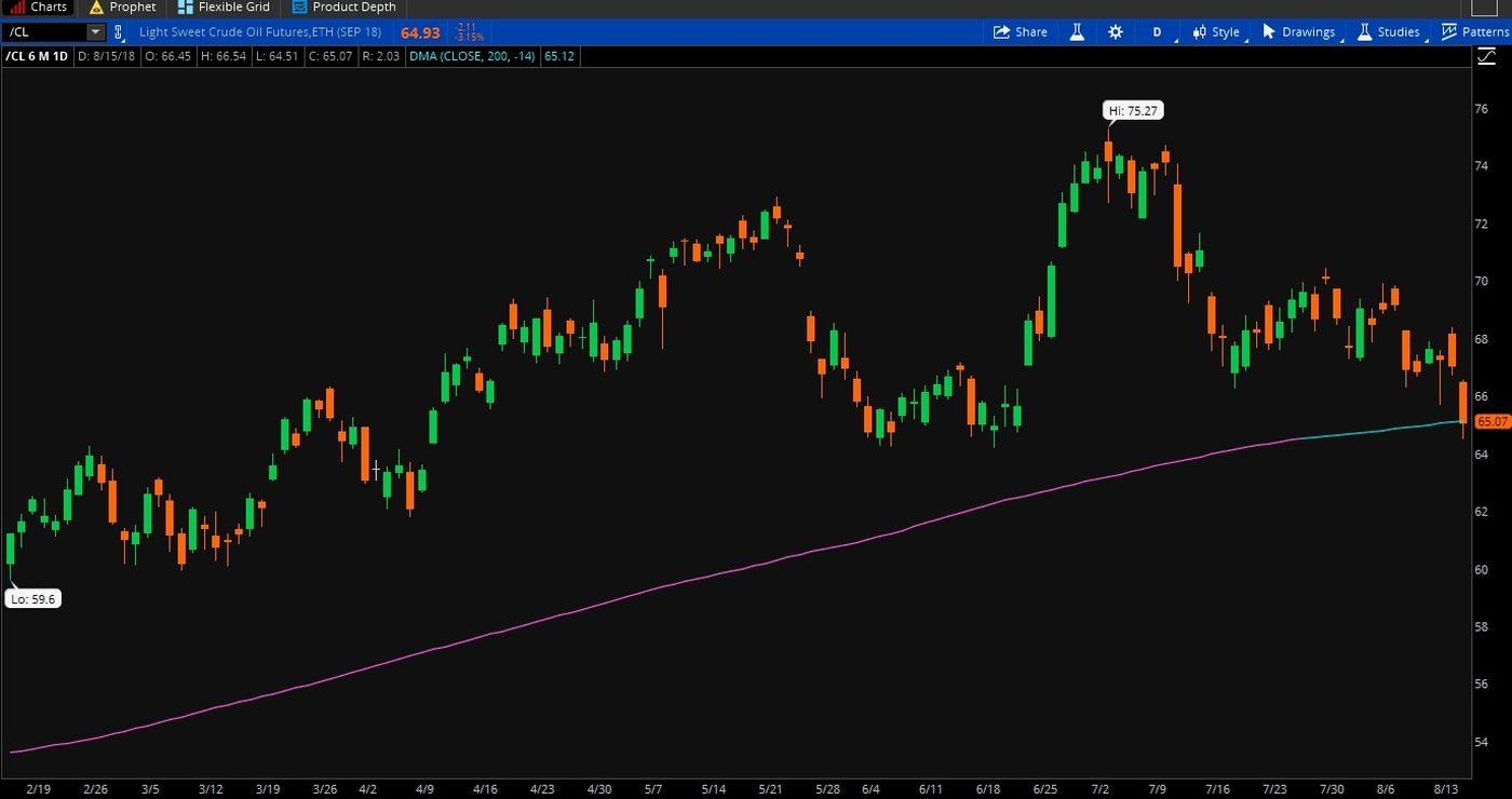 U.S. crude oil futures are now down more than $10 from highs in the mid-$70s a barrel back in the late spring. Prices spent part of Wednesday below $65 a barrel. Which sets up an interesting technical picture. The front-month U.S. crude contract hasn’t been below $64 a barrel since early April, and has tested that mark a couple times since and bounced off (see Figure 1 above). Sometimes, though not always, a dive below such a support level can bring additional selling as longs abandon their positions. Another point to consider: The crude contract came within a hair of its 200-day moving average of around Wednesday, a level now near $65 and seen by some as a key technical point. Trade war fears, slumping stock markets, and a strong dollar have all helped combine to gang up on oil lately.