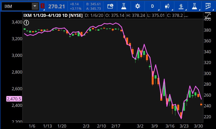 FIGURE 1: AS GOES FINANCIALS… Q1 was a rough quarter for the S&P 500 Index (SPX—purple line) as well as the sectors that comprise the index, such as Financials (IXM—candlestick). Data source: S&P Dow Jones Indices. Chart source: The thinkorswim® platform from TD Ameritrade. For illustrative purposes only. Past performance does not guarantee future results.