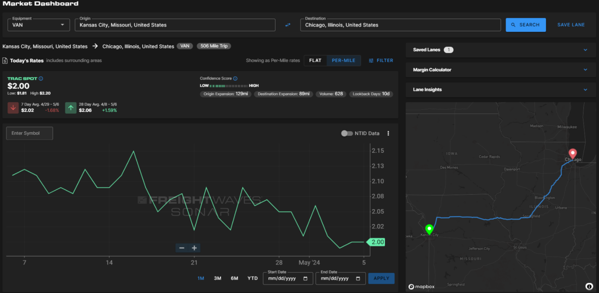 TRAC Tuesday. This week's TRAC lane is a jaunt through the Midwest from Kansas City, Missouri, to Chicago. This 506-mile trip to the Windy City has slumping rates. The National Truckload Index is at $2.20 per mile, whereas this trip is at $2 per mile. Times are tough when the spot rate is lower than the NTI. Chicago's Outbound Tender Reject Index being at 1.27% is weighing heavily on the spot rate. Kansas City is having some upward momentum for its OTRI, but the index is only at 3.27%, which isn't quite enough to breathe life back into these rates. An all-in rate of $1,012 before margin should readily cover this load.