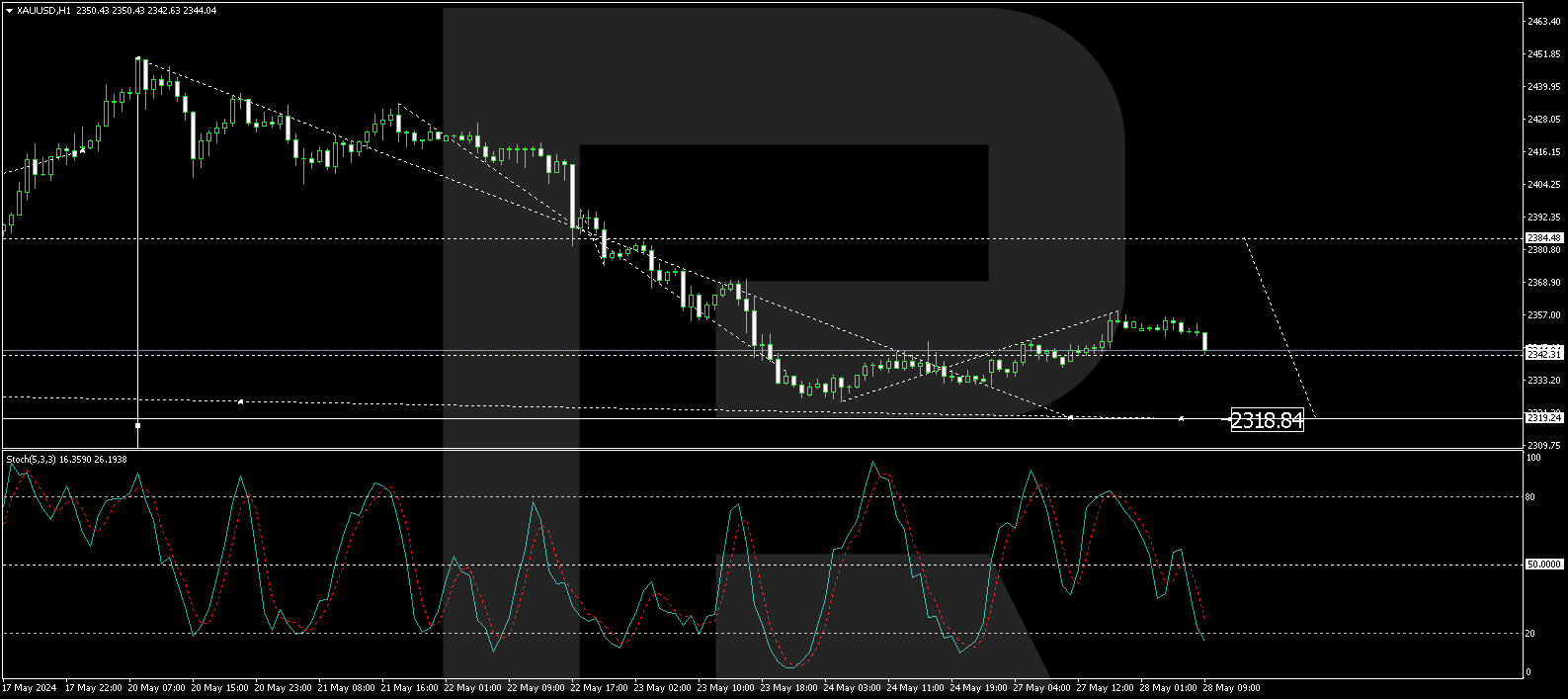 On the H1 chart, a decline to 2325.40 has been executed, followed by the formation of a growth structure to 2342.31. A consolidation range has formed around this level, with a correction wave to 2358.50, starting with an upward exit. Today, a decrease to 2342.31 (testing from above) has been executed. The new consolidation range is practically outlined. A downward breakout from this range could lead to another downward impulse to 2318.85. Further development towards 2384.50 is possible if the price breaks upwards, continuing the correction to 2384.85. Afterwards, a decline along the trend to 2318.85 is likely. This scenario is technically confirmed by the Stochastic oscillator, with its signal line having broken through 50 and continuing its decline to 20.