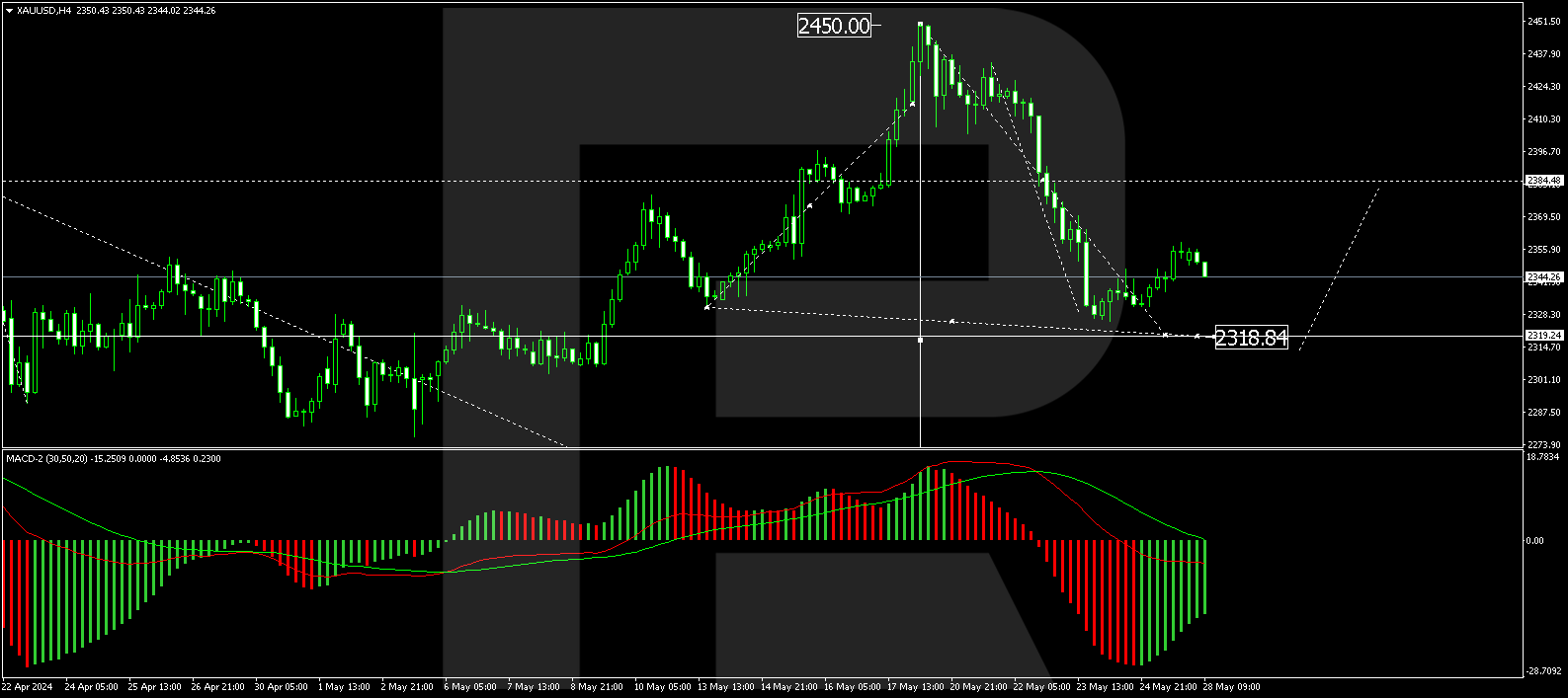 On the H4 chart of XAU/USD, a second downward impulse to the 2340.00 level has been formed. Today, a correction to 2358.50 has been executed. A downside movement to 2341.44 is expected, where a consolidation range may form. If the price breaks upwards from this range, a further correction towards 2384.80 could be considered. Conversely, a downward breakout could open the potential for a decline to 2318.80, the first target of the decline wave. This scenario is technically supported by the MACD indicator, with its signal line below zero and pointing strictly downwards towards new lows.